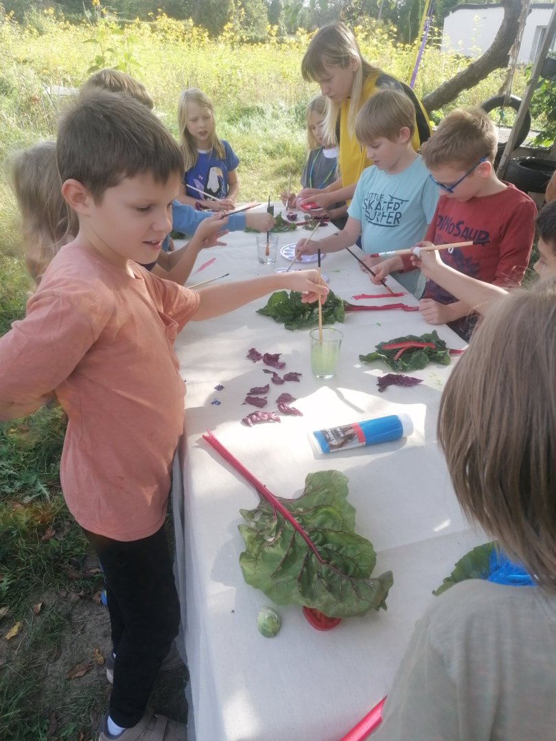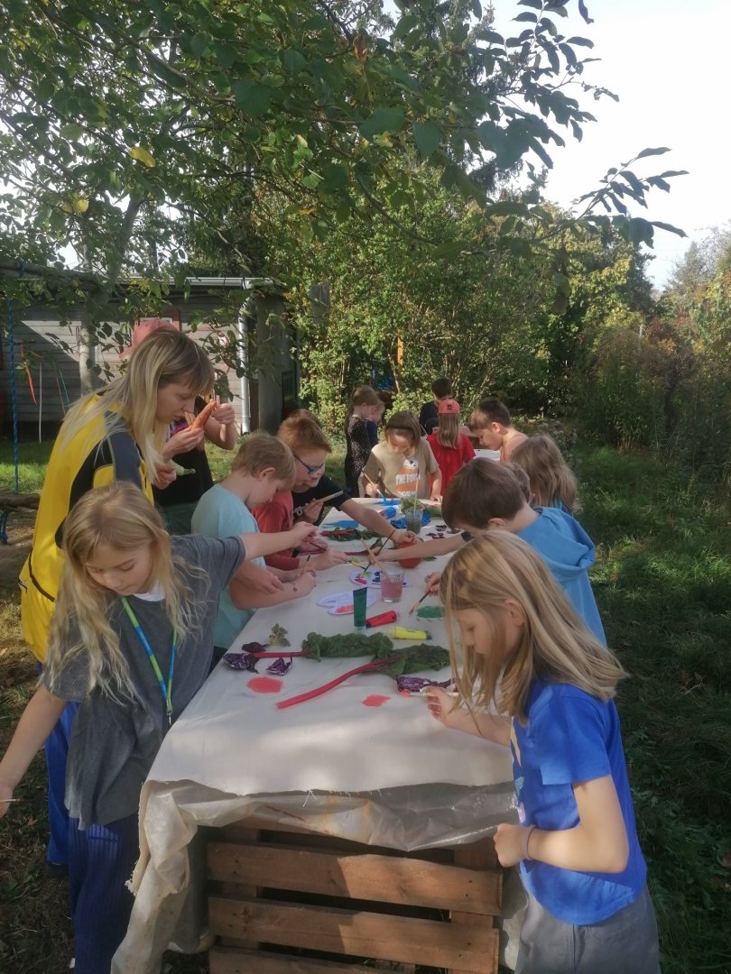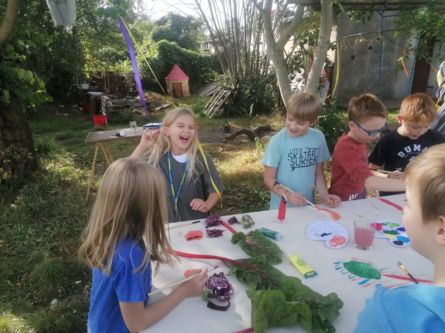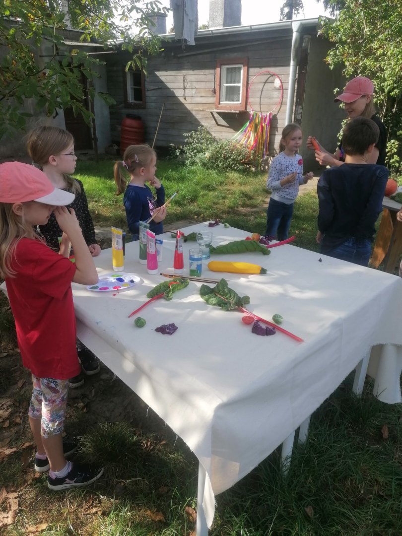 We wtorek, 3 października, w ramach wspierania inicjatyw lokalnych i współpracy naszej szkoły z Mikro Domem Kultury przy ulicy Lotaryńskiej 6, klasa 2b uczestniczyła w warsztatach plastycznych. Najpierw dzieci zostały oprowadzone po niewielkim ogródku warzywnym, gdzie oglądały pięknie rosnące papryki, dynie, pory, buraki naciowe i ostatnie ogórki. Podziwiały też rabatkę z pachnącymi ziołami. Gospodynie MDK wspomniały uczniom o historii Osiedla Ogródkowego Naramowice. Okazało się, że pierwsze działki z niewielkimi domkami powstały w 1933 roku, a więc mają już 90 lat! Aby uczcić ten jubileusz, w najbliższą niedzielę w godzinach od 12:00 do 16:00 odbędzie się tutaj Święto Osiedla i Koncert Siema Ziemia. Uczniowie klasy 2b zostali poproszeni o namalowanie fantazyjnych warzyw o organicznych kształtach na wielkich płótnach, które zostaną zawieszone w przestrzeni ogrodu. Dzieci z ogromną pasją zaangażowały się w proces twórczy, co widać na zdjęciach umieszczonych w galerii. Wszyscy miło spędziliśmy tutaj czas i na pewno jeszcze odwiedzimy to ciekawe miejsce.