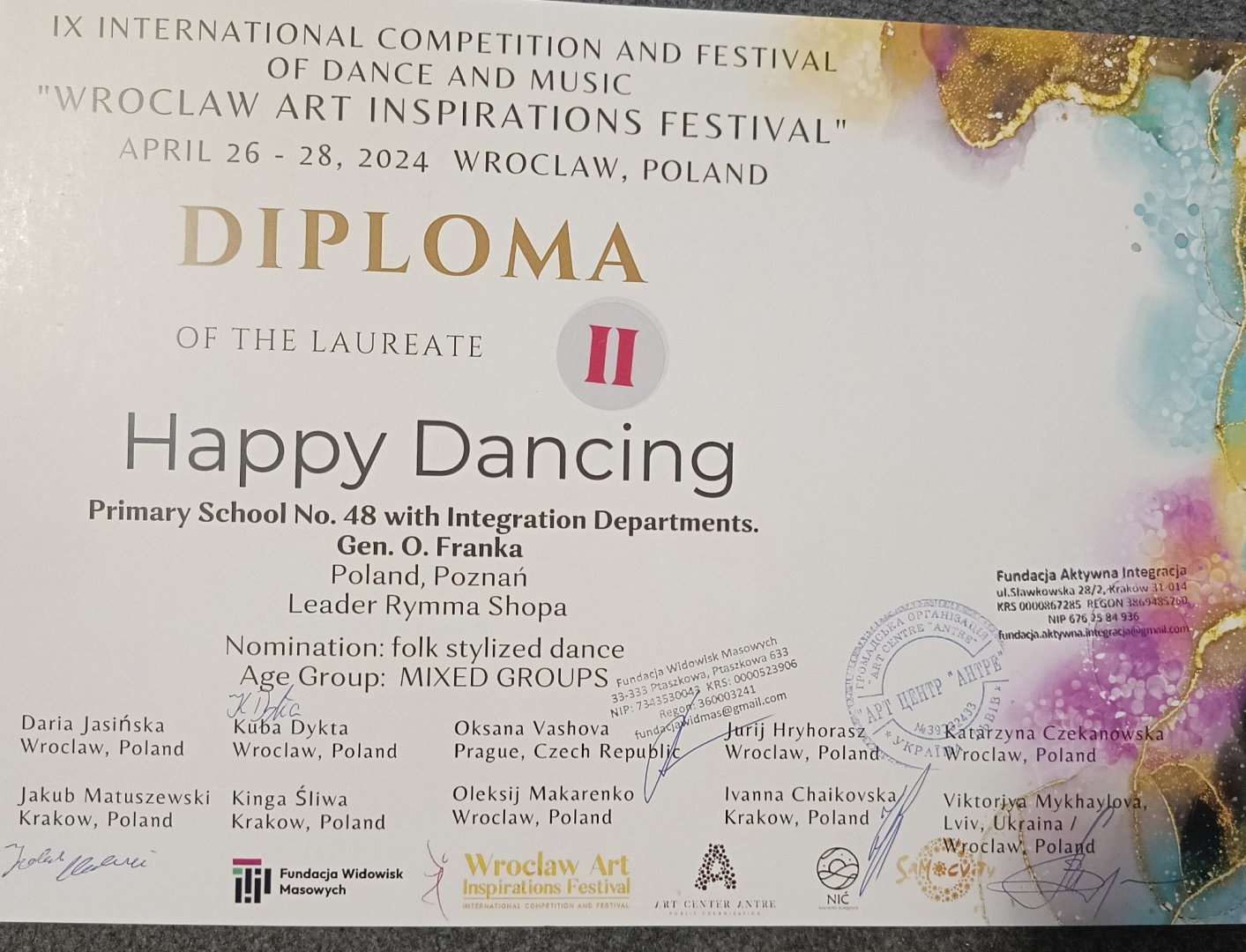 Zespół taneczny “Happy Dancing” z naszej szkoły wziął udział w Międzynarodowym Festiwalu Konkursie Wroclaw Art Inspirations Festival, który odbył się 27.04.2024 we Wrocławiu.