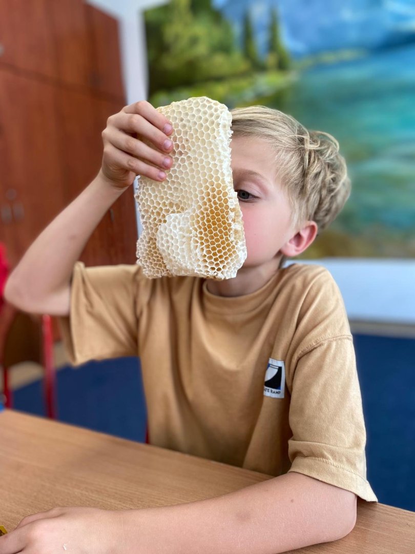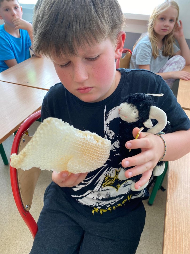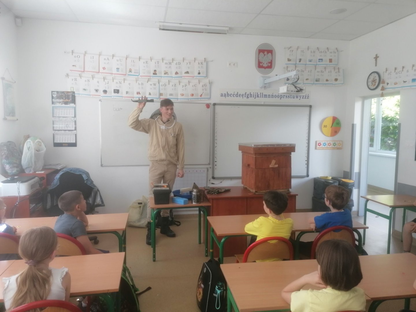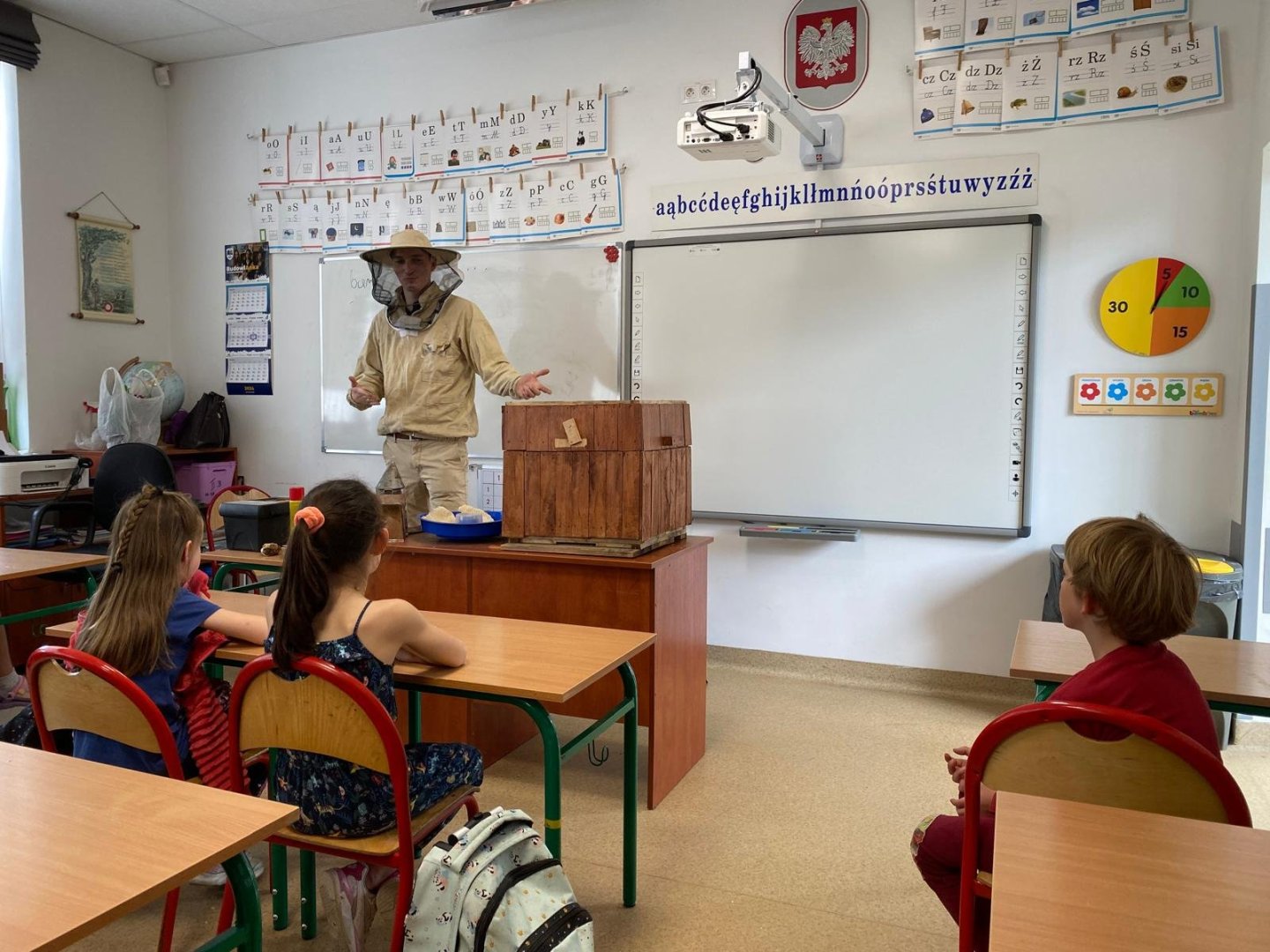 W poniedziałek, 20 maja, obchodziliśmy w naszej szkole Światowy Dzień Pszczół. Z tej okazji, klasy młodsze odwiedził pan pszczelarz, który bardzo ciekawie opowiadał o pszczołach, ich zwyczajach i ciężkiej pracy na rzecz człowieka i środowiska przyrodniczego. Dzieci mogły zobaczyć prawdziwy ul wypełniony ramkami oraz poznać różne przedmioty i narzędzia wykorzystywane podczas pracy przy pszczołach. Niektóre z nich miały ciekawe nazwy, jak np.: podkurzacz, odsklepiacz, węza czy klateczka. Uczniowie chętnie oglądali, wąchali i dotykali różne produkty pszczele. Poznali rodzaje miodów oraz ich nazwy. Zajęcia wzbudziły spore zainteresowanie wśród dzieci, które zadawały wiele pytań. Warsztaty pszczelarskie okazały się bardzo ciekawe i pouczające.