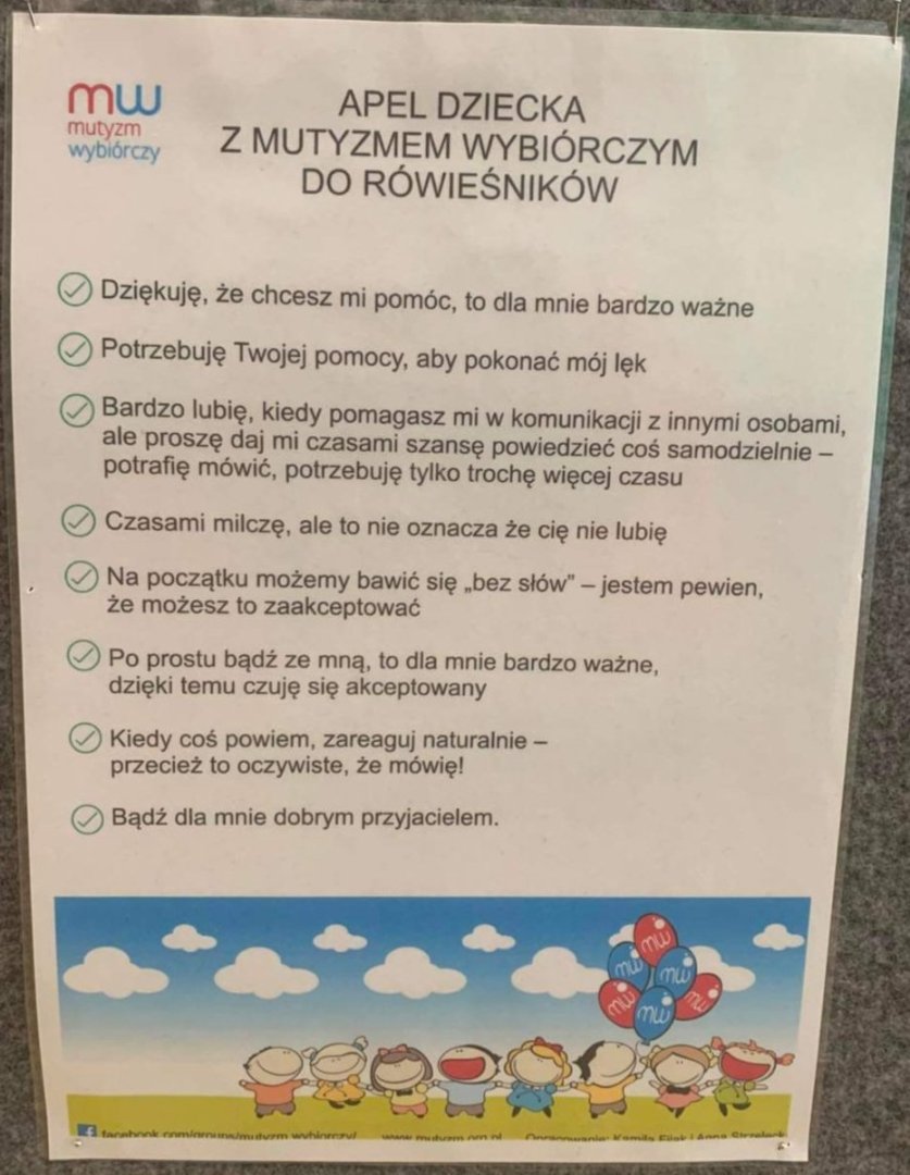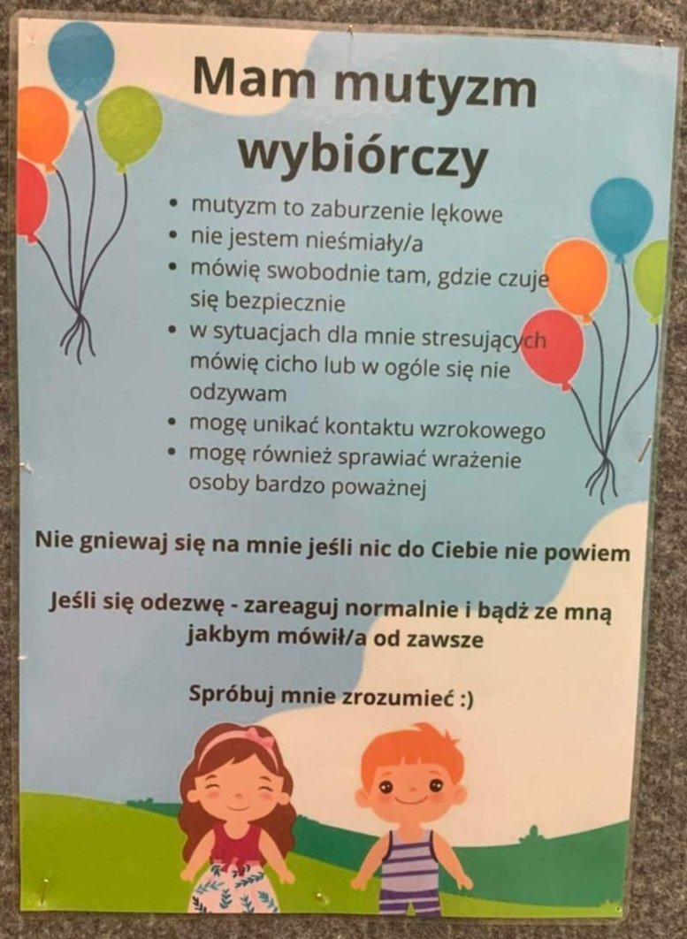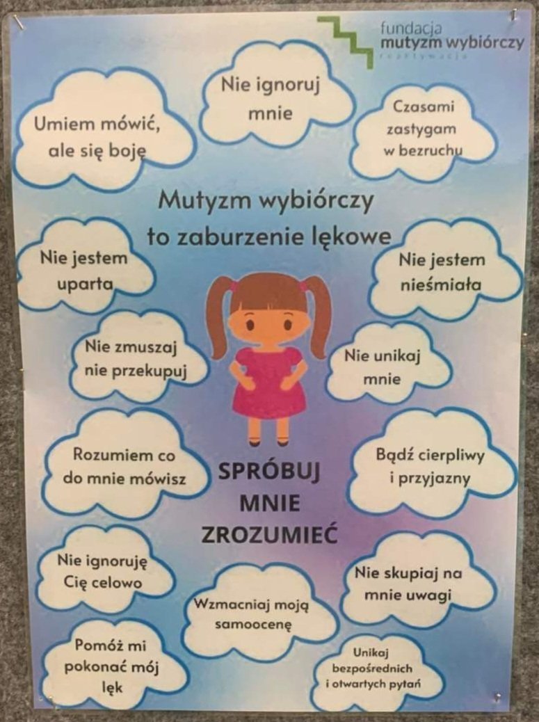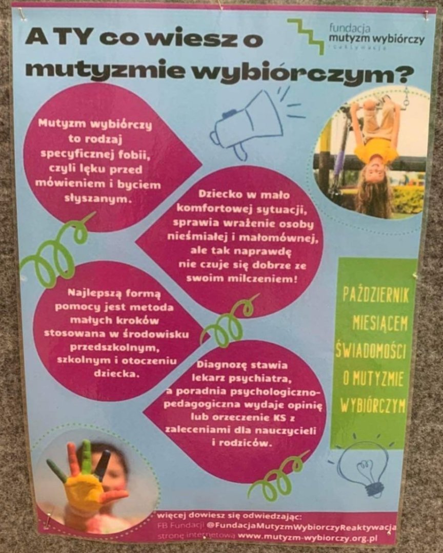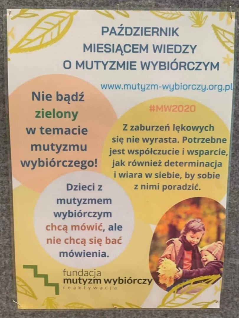 Wystawa “Mutyzm Wybiórczy” Data 14 października 2024 W miesiącu październik w naszej szkole odbywała się wystawa dotycząca mutyzmu wybiorczego. Udostępnij: Mikołaj Grembowski Poprzedni post Życzenia z okazji Dnia Edukacji Narodowej 14 października 2024 Następny wpis XVI edycja akcji medialno-edukacyjnej: „Zapal znicz pamięci” – 20 października 2024 r. 18 października 2024