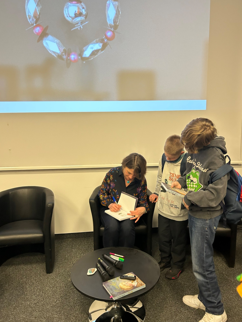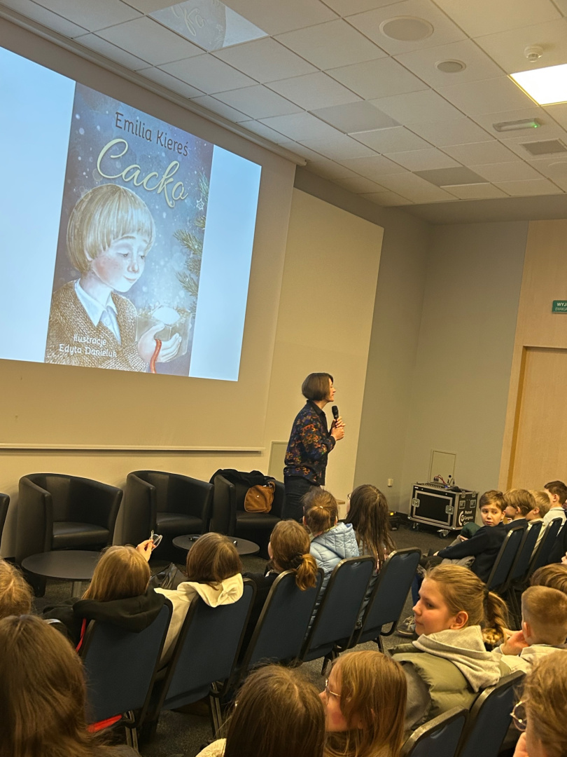 Uczniowie wzięli udział w spotkaniu z pisarką Emilią Kiereś, autorką książki „Cacko”, niektórzy zdobyli nawet autografy do własnych egzemplarzy.