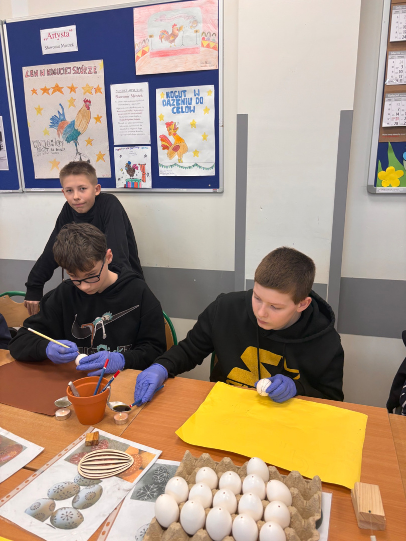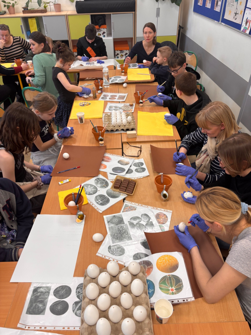Pod czujnym okiem prowadzącej, przy wsparciu rodziców oraz wychowawczyni, uczniowie ozdabiali jajka woskiem, tworząc piękne i niepowtarzalne wzory. Następnie barwili je w kolorowych kąpielach, odkrywając magiczny efekt tej tradycyjnej techniki. Praca wymagała precyzji i cierpliwości, ale efekty były zachwycające!